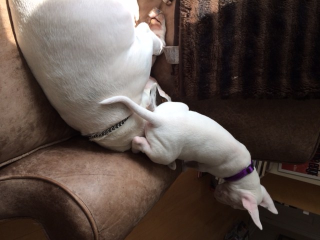 And because Michael insisted on using a cat (you’ll read why in a minute), I have to counter things by offering this picture of my dogs. The new puppy’s name is Squirt. She’s the one sitting on Schmooze’s head.